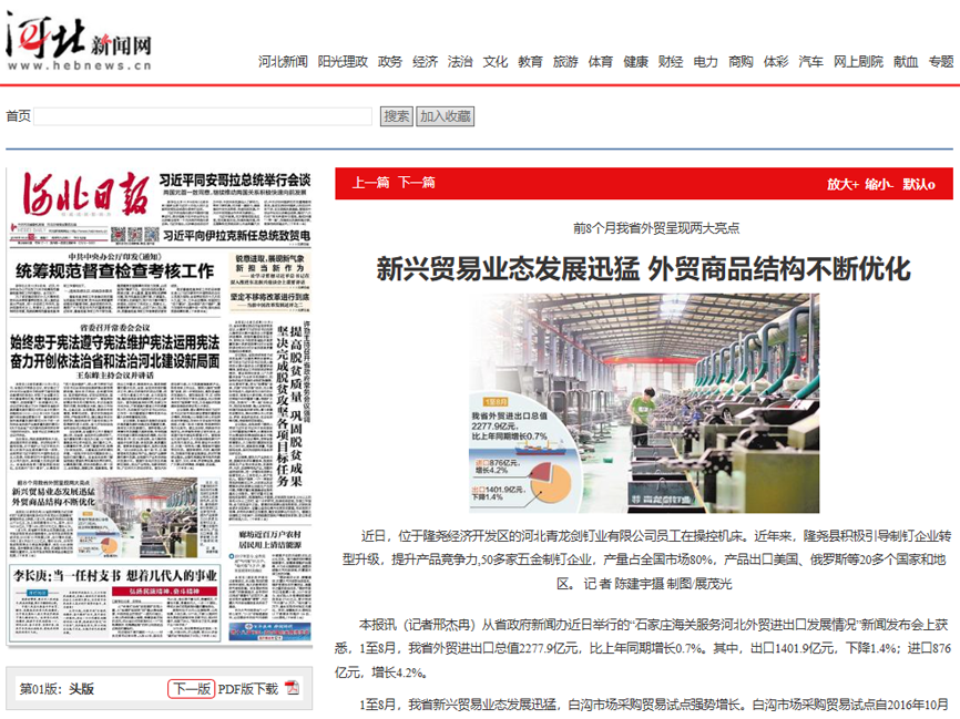 青龍劍釘業被《河北日報》頭版報道!