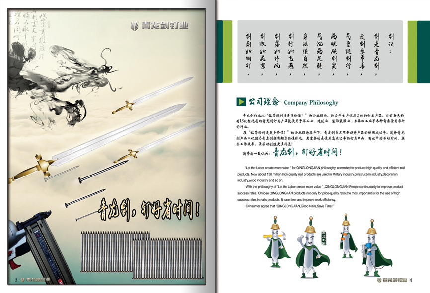 青龍劍釘業(yè)以“讓勞動創(chuàng)造更多價值!”為企業(yè)理念,致力于生產(chǎn)優(yōu)質(zhì)高效的釘類產(chǎn)品。目前每天約有1.3億根優(yōu)質(zhì)的青龍劍釘類產(chǎn)品被使用于軍工業(yè)、建筑業(yè)、裝飾裝潢業(yè)、木器加工業(yè)等各種需要緊固零件的行業(yè)。