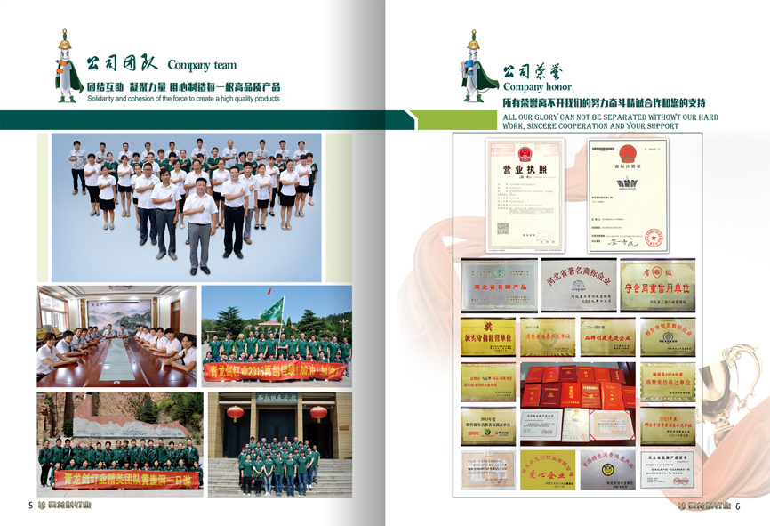 公司視產(chǎn)品質(zhì)量如生命,產(chǎn)品全部采用國家大型鋼廠優(yōu)質(zhì)線材,嚴格按照國家標(biāo)準(zhǔn)進行生產(chǎn),產(chǎn)品暢銷全國120多個城市和地區(qū),并遠銷韓國、馬來西亞、歐美及非洲等國家和地區(qū)。企業(yè)先后獲得:“河北省著名商標(biāo)企業(yè)”、“河北省首屆特色消費滿意產(chǎn)品”、“河北省名牌產(chǎn)品”、“誠實守信經(jīng)營單位”、“省級守合同、重信用單位”等眾多的 榮譽稱號。“青龍劍”商標(biāo)被評為“河北省著名商標(biāo)”。