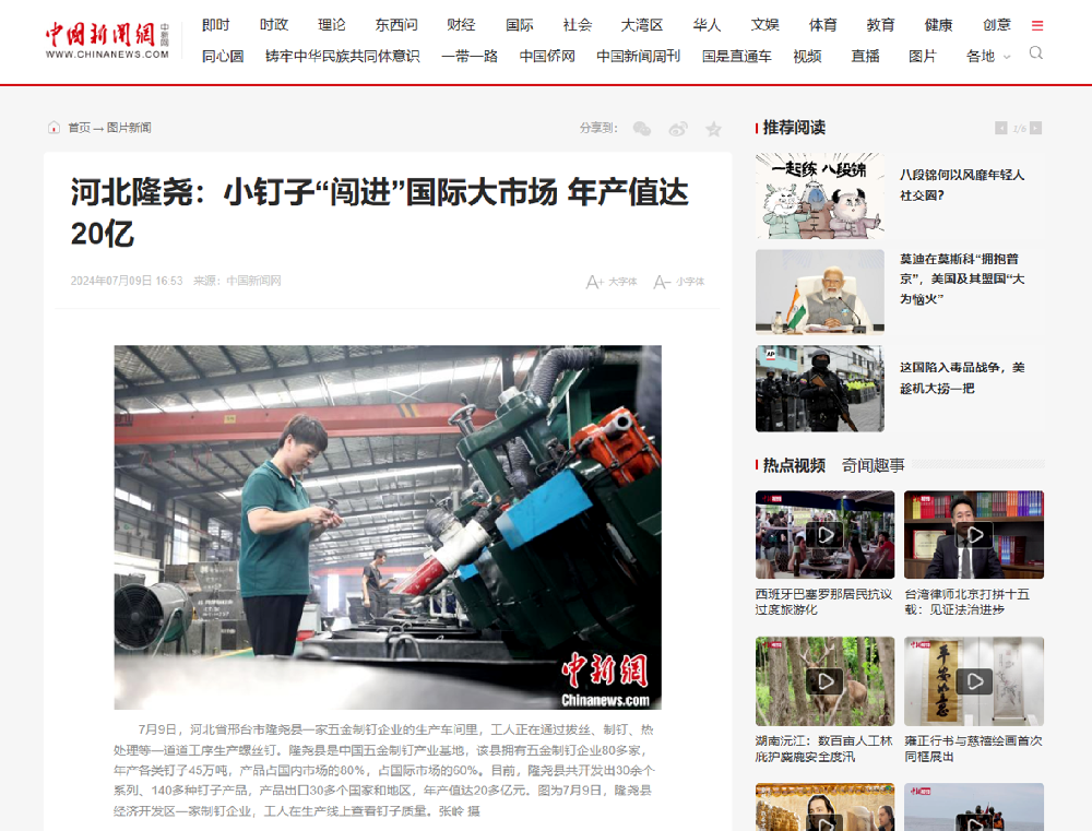 近日,中國新聞網記者走進河北隆堯青龍劍釘業有限公司,對制釘車間的生產工序及車間環境進行了解和拍攝。7月9日下午,青龍劍釘業榮登中國新聞網。青龍劍釘業將不斷探索、研發產品,通過技術升級、產品創新,為社會提供更高效、更安全緊固產品,提供更全面的基材連接緊固系統解決方案,樹立行業標桿,助力國家建設![詳情] 2024-07-12 09:40:06